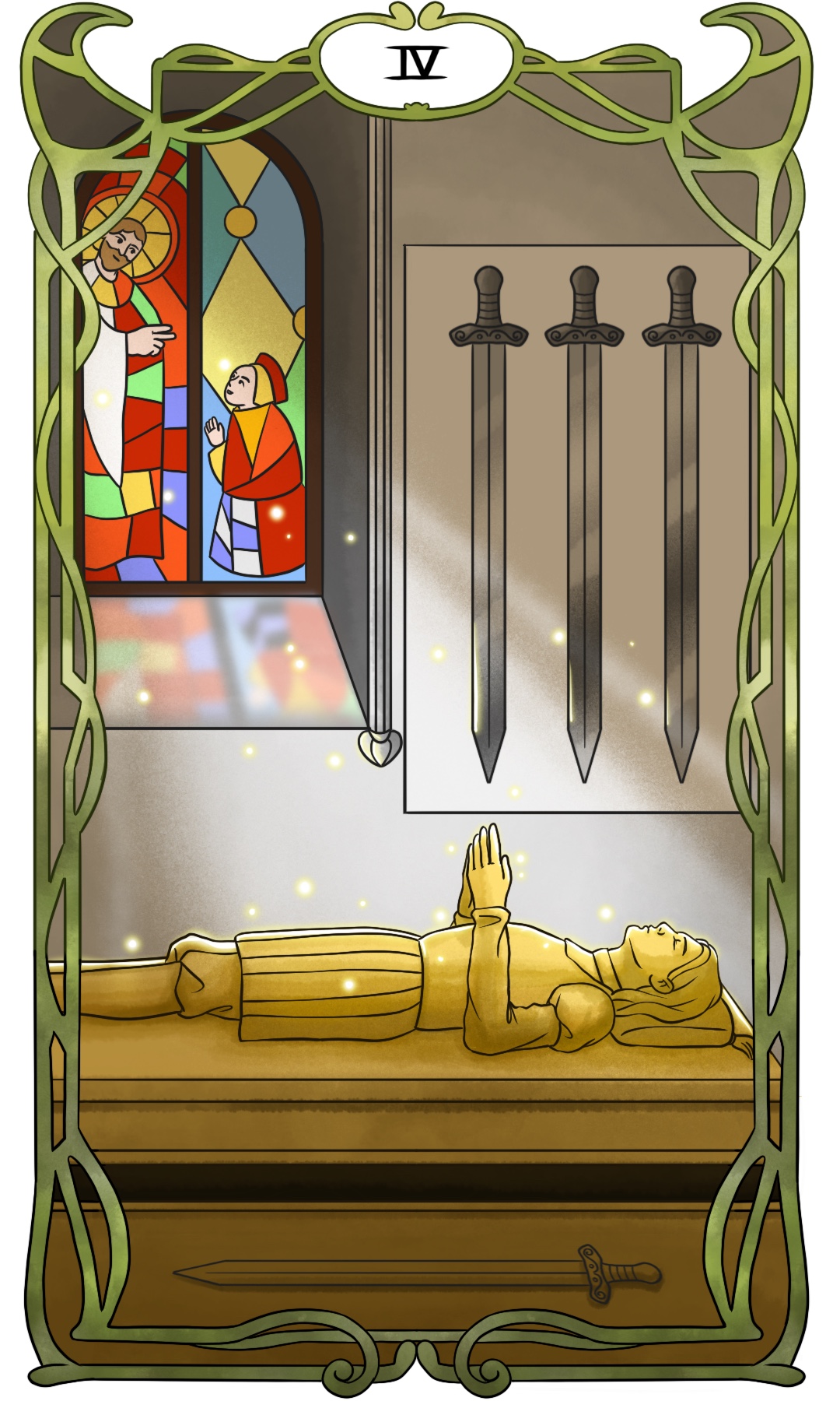 4번 소드는 과거의 상처와 긴장에서 벗어나 차분히 회복하는 시간을 뜻합니다. 무리해서 새로운 사람을 만나려 하거나 감정을 급하게 털어내려 하지 말고 충분히 쉬며 회복하세요. 이 과정이 있어야 상처가 덧나지 않고 새로운 시작도 건강하게 맞이할 수 있습니다.