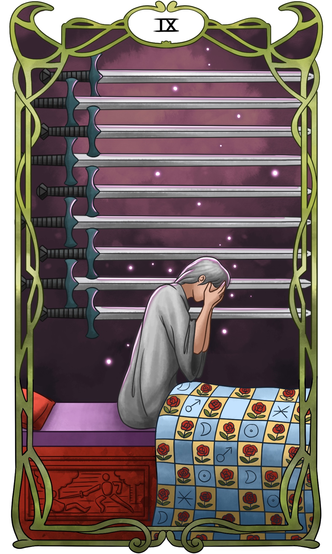 소드 9 정방향은 걱정과 죄책감, 불면을 상징하는 카드입니다. 타인의 시선을 의식하는 것이 이 카드로 나왔다면, 이는 명백한 불안의 신호입니다. 실제 상황보다 더 부정적으로 상상하고, 작은 반응에도 “내가 실수했나?”라고 확대 해석합니다. 이 감정은 관계를 지키기 위한 것이 아니라, 스스로를 보호하려는 과도한 경계심에서 비롯됩니다.