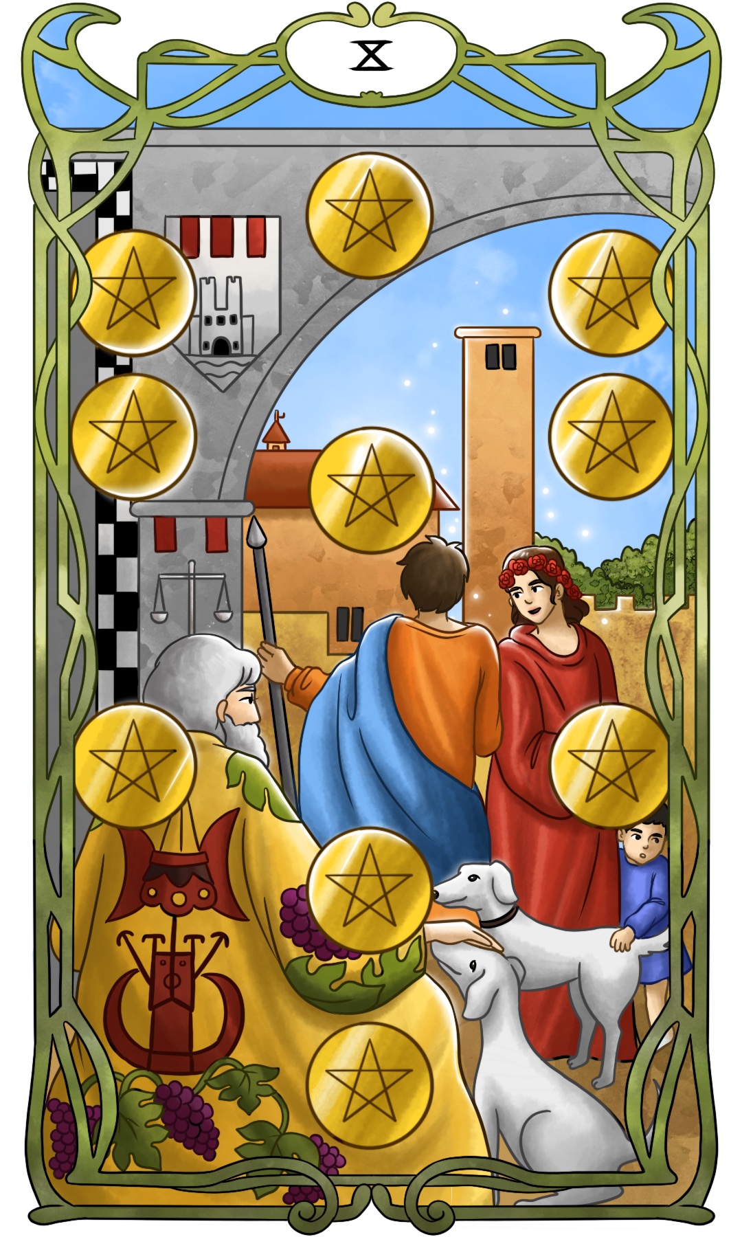 펜타클 10 정방향은 가정, 재정, 현실 기반과 관련된 안정의 카드입니다. 이번 달은 실질적인 결과가 보입니다. 금전적으로는 무리한 확장보다 안정 유지가 핵심이며, 가족이나 가까운 사람과의 관계에서 든든함을 느끼게 됩니다.