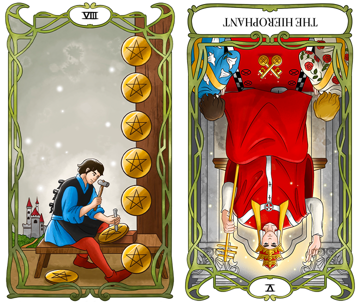 8 of Pentacles (정방향) + The Hierophant (역방향)