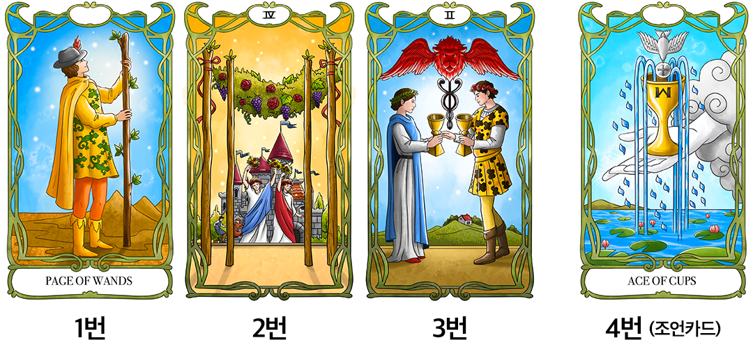 연인으로 발전하고 싶어 하는 내담자분의 강한 의지가 느껴지는 사연이었는데요. 이 마음을 가득 담아 3장의 카드와 1장의 조언 카드를 뽑아 보았습니다. 현재 본인이 썸을 타고 있거나 상대방과 관계를 발전시키고 싶은 분들이라면 내담자 분과 같은 마음을 가지고 아래 결과를 확인해 보세요!